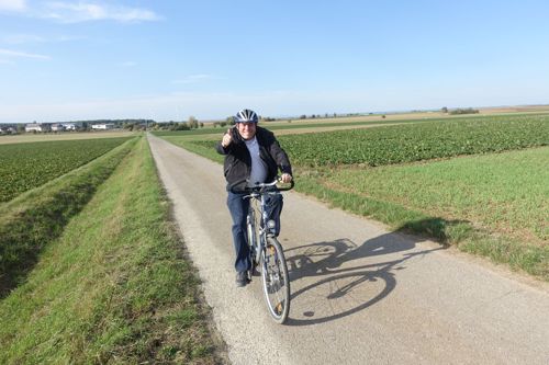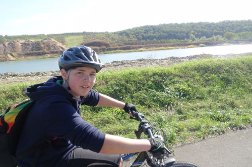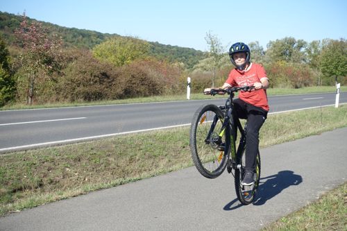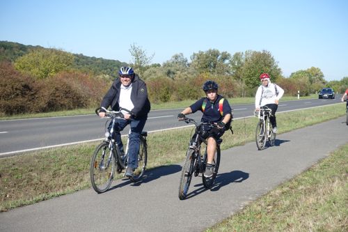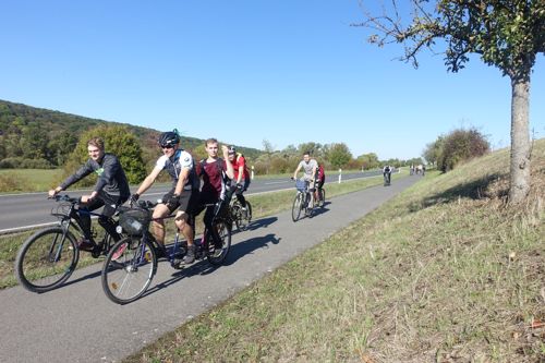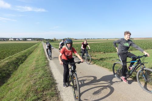 Von Schweinfurt führte die Tour über ein Naturschutzgebiet bei Grafenrheinfeld darauf durch die Weinberge am Main entlang bis Volkach und weiter zum malerischen Ort Handthal am Fuße des Steigerwaldes. Teamleiter Ferdinand Gehrig erklärte zu Beginn: „Die Tour ist wie das Leben: Wir haben ein Ziel, aber um es zu erreichen reicht nicht ein einzelner Sprint. Es braucht Ausdauer und eine Gemeinschaft, die begleitet und motiviert.“ Etwa 46 Kilometer sowie rund 250 Höhenmeter sind zu bewältigen. „Hätte nicht gedacht, dass ich das schaffe“, meint der jüngste Teilnehmer als er sich bei der Ankunft erschöpft auf den Boden legt, „aber jetzt bin ich stolz darauf, dass ich nicht aufgegeben habe.“