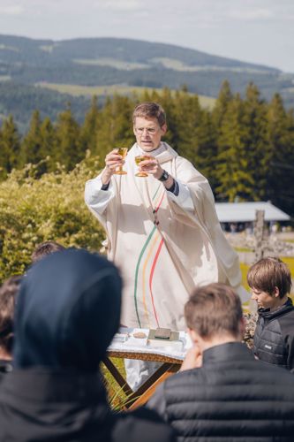 Am Sonntag übernahmen die Jugendlichen die musikalische Gestaltung der Sonntagsmesse in der Pfarrei St. Martin in Blaichach. In der Predigt berichtete P. Martin Baranowski LC von seiner persönlichen Erlebnissen mit dem Rosenkranzgebet und lud dazu ein, durch die Betrachtung der Rosenkranzgeheimnisse im Alltag die Beziehung zu Christus zu stärken: „Der Rosenkranz ist die Zusammenfassung des Evangeliums. Er kann in jedem Alter, unter allen Umständen gebetet werden. Es ist eine wertvolle und wichtige Hilfe, die Gott uns gibt. Gott gefällt es, den Feind durch so einfache Mittel zu besiegen.“