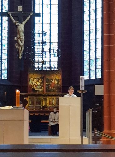 Zum Abschluss der Tagesveranstaltung versammelte sich die Gruppe mit Eltern zur Messe im Frankfurter Dom St. Bartholomäus. In der Predigt legte P. Martin Baranowski, der die Jungs geistlich begleitet, die Schrifttexte der Vorabendmesse zum zweiten Fastensonntag aus. In der ersten Lesung wurde Abraham zunächst zum Opfer seines Sohnes aufgefordert dann aber doch von Gott davor bewahrt. Das Evangelium berichtete von der Verklärung Christi: „Wenn Gott uns um etwas bittet, dann möchte er uns nichts wegnehmen, sondern uns beschenken. Das haben wir das heute erlebt: Für viele Kunden war die Einladung zur Spende eine unvorhergesehene Überraschung, aber keiner hat seine Gabe ohne ein Lächeln im Gesicht abgegeben. So erscheint auch der Glaube oft eine zunächst unangenehme Herausforderung, wie die Jünger, die der Berg bestiegen, doch dann überrascht Gott mit seiner Liebe und Großzügigkeit, die alles übertrifft.“