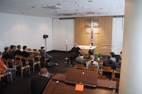 Wie der Glaube auch den Flughafen prägt, erläuterte Flughafenseelsorger P. Heinz Goldkuhle SAC im anschließenden Gespräch. Der Pallotinerpater ist seit fünf Jahren Pfarrer am Fraport und berichtete von den vielfältigen Aufgaben, wie Kirche dort wahrnimmt: Zunächst die Seelsorge für Reisende und Mitarbeiter: Beichten, Begleitung von Wiedersehensfreude und Abschiedsschmerz, Aufnahme von Gestrandeten und Menschen in Notlagen. „Ein wichtiges Feld ist die Abschiebungsbeobachtung: Hier ist die Flughafenseelsorge ein wichtiges Fenster der Öffentlichkeit in einem nichtöffentlichen Bereich.“ Auch um Flüchtlinge sowie um rund 300 Obdachlose, die auf dem Flughafen leben, kümmert sich der Priester. Sein Rat an die jungen Besucher aus der Alltagserfahrung: „Lernt Sprachen!“