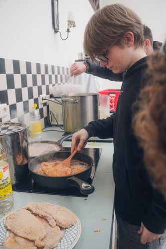 Besonders handfest ging es in der Küche zu. Unter fachkundiger Anleitung bereitete ein Team das Abendessen für die ganze Gruppe vor. Die Jungen panierten Schnitzel, kochten Soße und richteten Salat an. Aus einzelnen Arbeitsschritten entstand so eine Mahlzeit für rund 40 Personen – und damit ein sichtbares Ergebnis gemeinsamer Anstrengung.