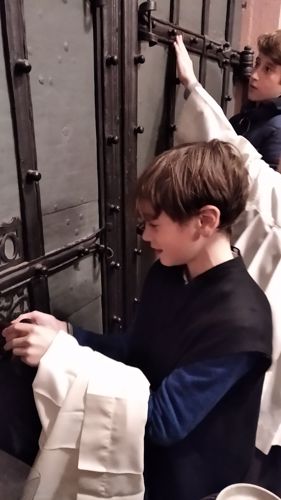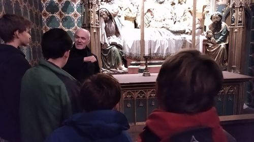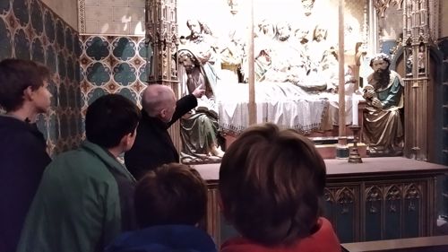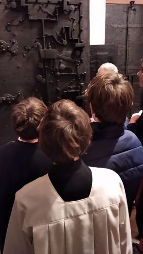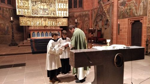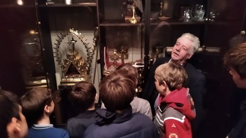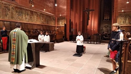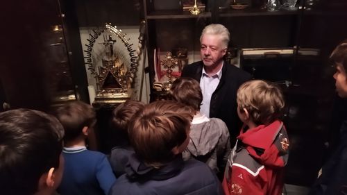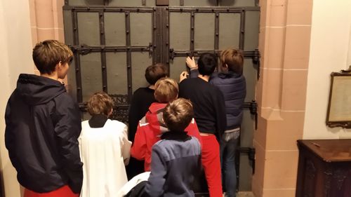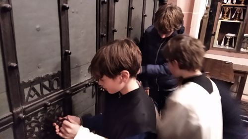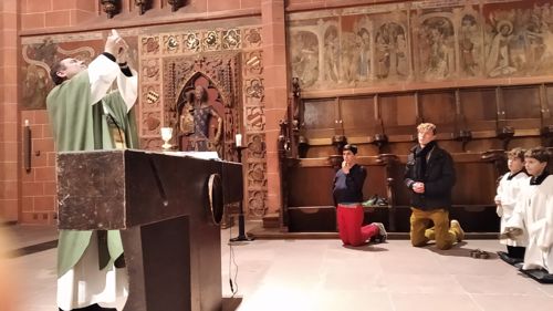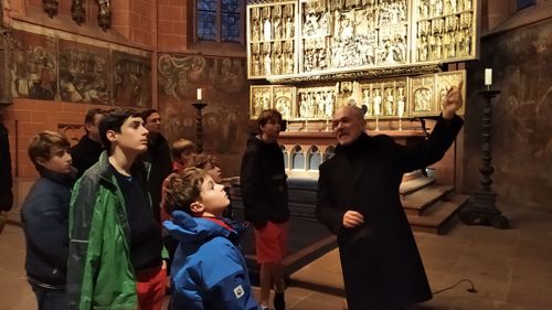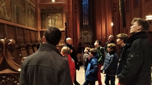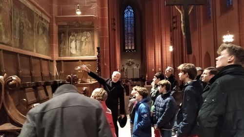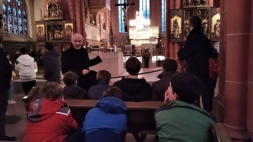 Rektor Dr. Stefan Scholz empfing die Gruppe zu einer Sonderführung durch den Frankfurt Dom, in dessen Wahlkapelle gemäß den Bestimmungen der Goldenen Bulle von 1356 die Kurfürsten die deutschen Kaiser wählten. Der Priester und Kunstexperte erklärte den Teilnehmern die Bedeutung und Glaubensaussagen des Kirchengebäudes sowie das Leben und Martyrium des hl. Apostels Bartholomäus, dessen Reliquien als besondere Kostbarkeit in Frankfurt aufbewahrt werden. Besonders bewunderten die Jungen die Tür zur damaligen Schatzkammer, in der die Reichsinsignien aufbewahrt wurden: vier Schlüssel und ein komplexer Mechanismus sind erforderlich, um ins Innere zu gelangen. Bei der anschließenden Messe im Hochchor des Gotteshauses bezog Jugendseelsorger P. Martin Baranowski die traditionsreiche Wahl auf die konkreten Entscheidungen im Lebensalltag: „Auch heute gibt es viele Herrscher, denen wir dienen. Welchen König wählst du für dein Leben?“